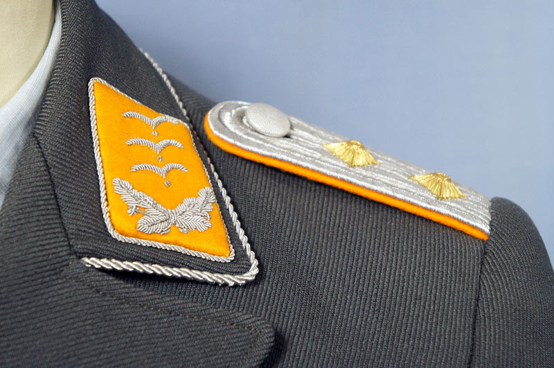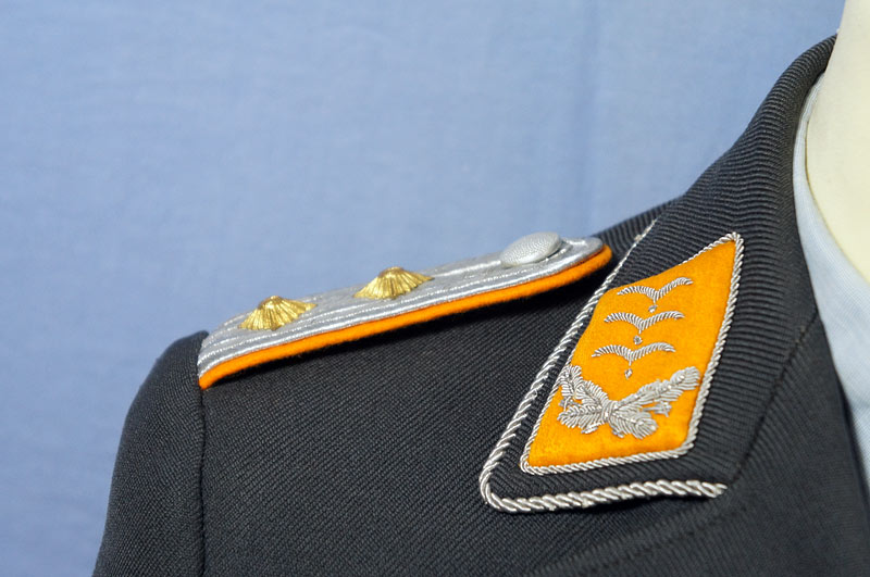 The shoulder boards and collar tabs are minty like the tunic and tightly machine sewn.